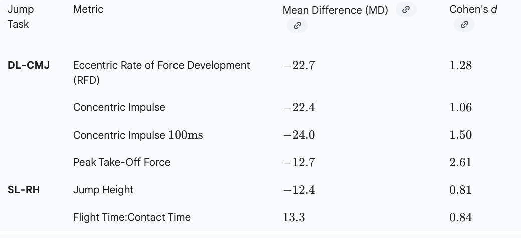DL-CMJEccentric Rate of Force Development (RFD)−22.71.28Concentric Impulse−22.41.06Concentric Impulse 100ms−24.01.50Peak Take-Off Force−12.72.61SL-RHJump Height−12.40.81Flight Time:Contact Time13.30.84