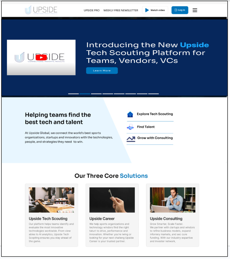 Upside Tech Scouting: An AI-based platform designed to help sports teams discover and vet top technologies to boost performance, save time and money, and maintain a competitive edge.