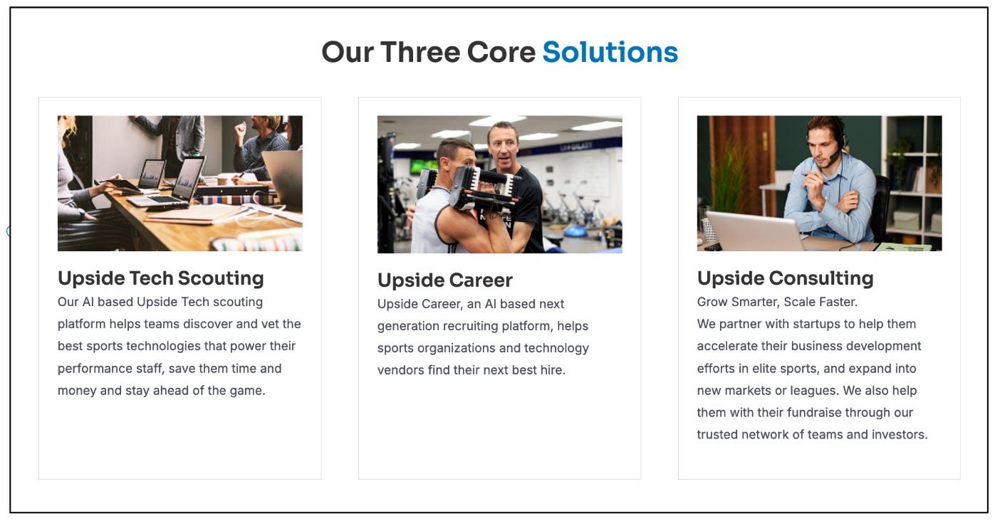 Upside Consulting: Focuses on accelerating business development for startups in elite sports by helping them expand into new markets/leagues and assisting with fundraising through a network of trusted teams and investors. Upside also helps teams with special projects focused on innovation, tech scouting, and so on.