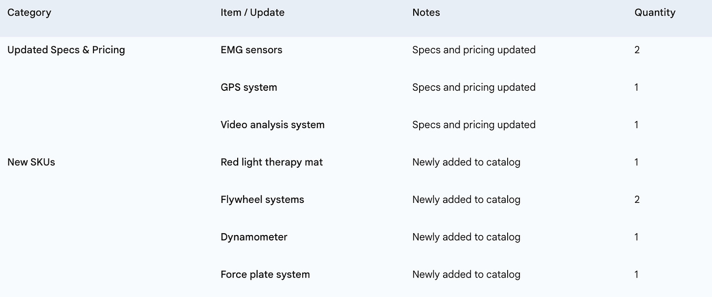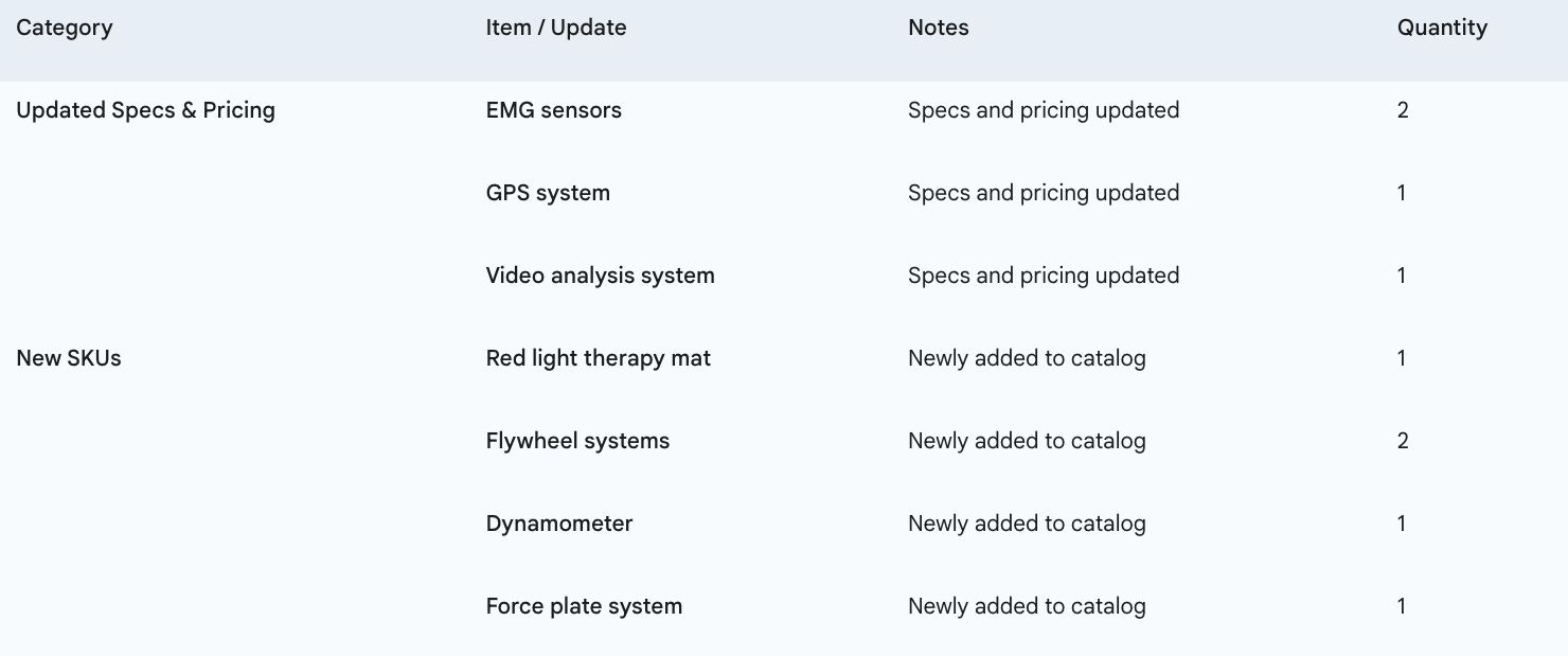 But technology in sports moves fastânew SKUs, product launches, and price changes are happening constantly. Thatâs why our team updates the database every single week, so that teams, practitioners, and decision-makers always have access to the most accurate and up-to-date information.