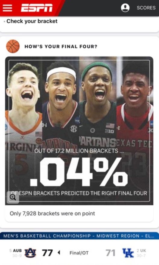 1 in 281 trillion: A 40-year-old neuropsychologist from Ohio correctly predicted 48 games in a row for his March Madness bracket, beating the previous best of 39 games set in 2017. The chance of achieving the new record through 50:50 guesswork is 1 in 281,474,976,710,656.
