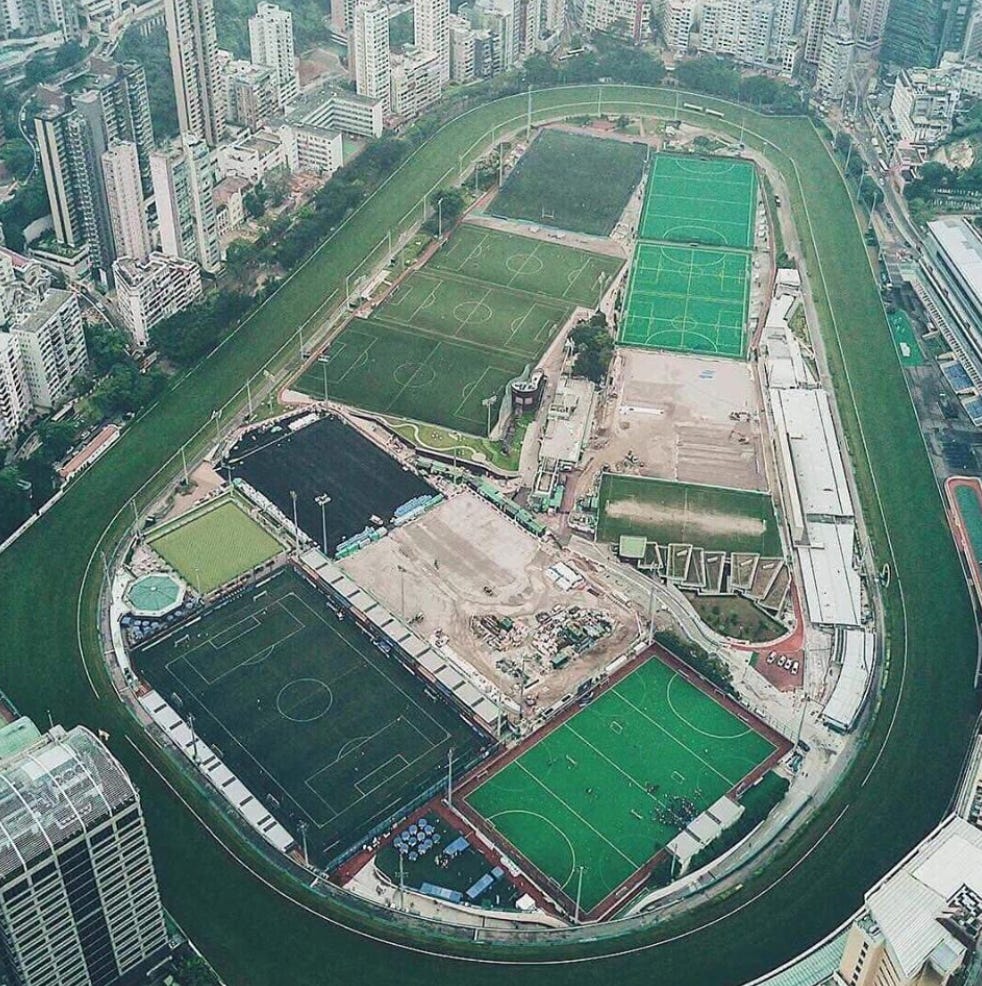 Can you imagine playing here? Located in the middle of the sprawling Happy Valley complex in Hong Kong, the setup contains 8 soccer pitches, a field hockey pitch, a rugby pitch, and numerous jogging tracks — all surrounded by the lively and cantankerous track of the Hong Kong Jockey Club, which can see up to 55,000 punters wagering on horses.