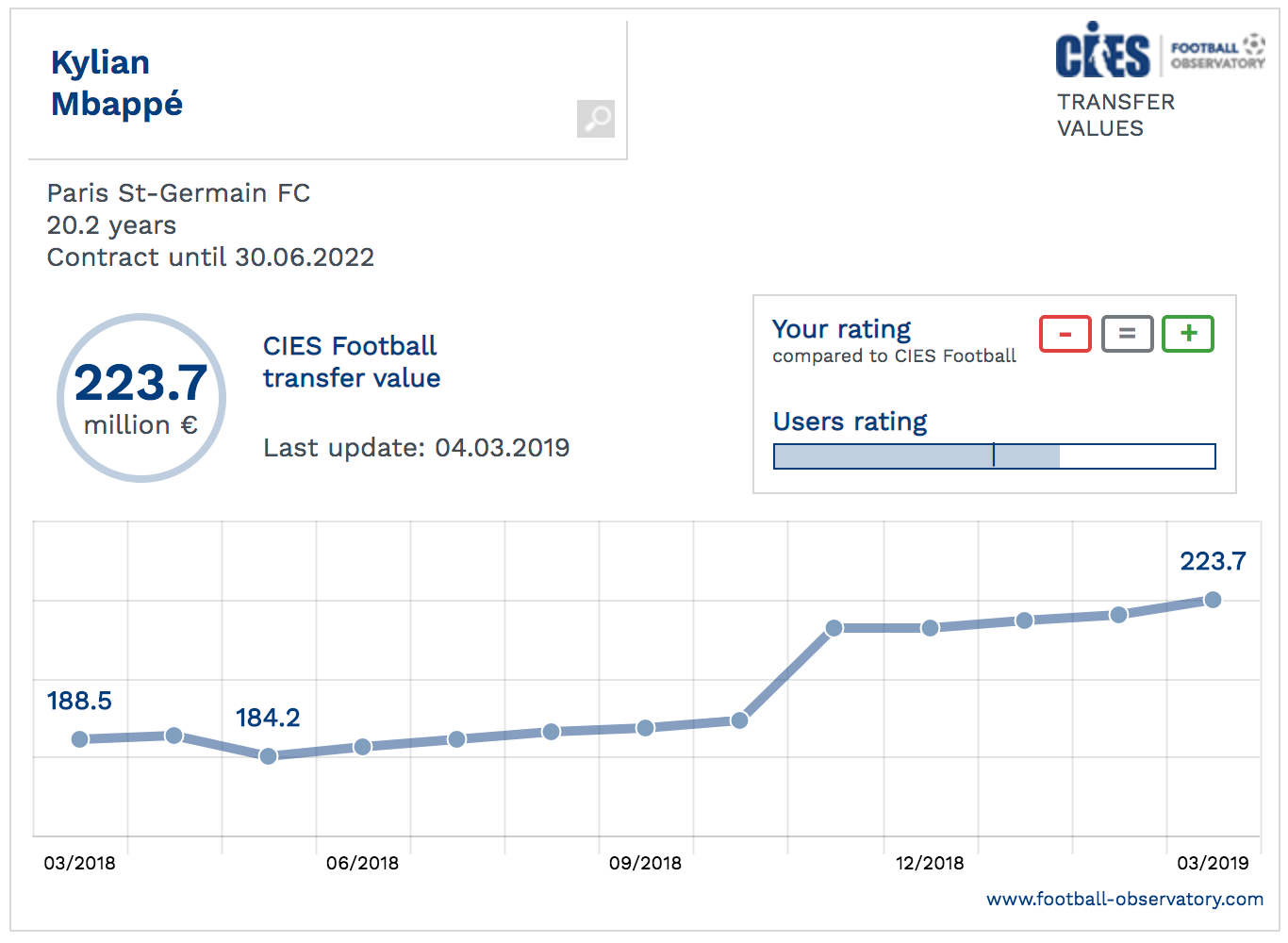 $250M: Real Madrid is allegedly ready to offer $250M to PSG for Kylian Mbappe. He is Zinedine Zidane’s top priority. as you can see in the chart below, Mbappe’s value has been increasing steadily since the World Cup.
