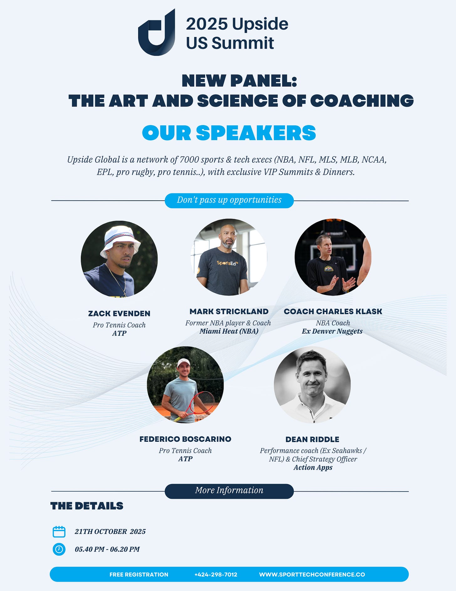 🏟️ 2025 Upside US Summit. 6 Days To Go. Speakers: Mark Strickland (Former NBA player / Miami Heat); Federico Boscarino (Tennis Coach); Robert Mazzucchelli (SportsEdTV). New Sponsor: Danu Sports.