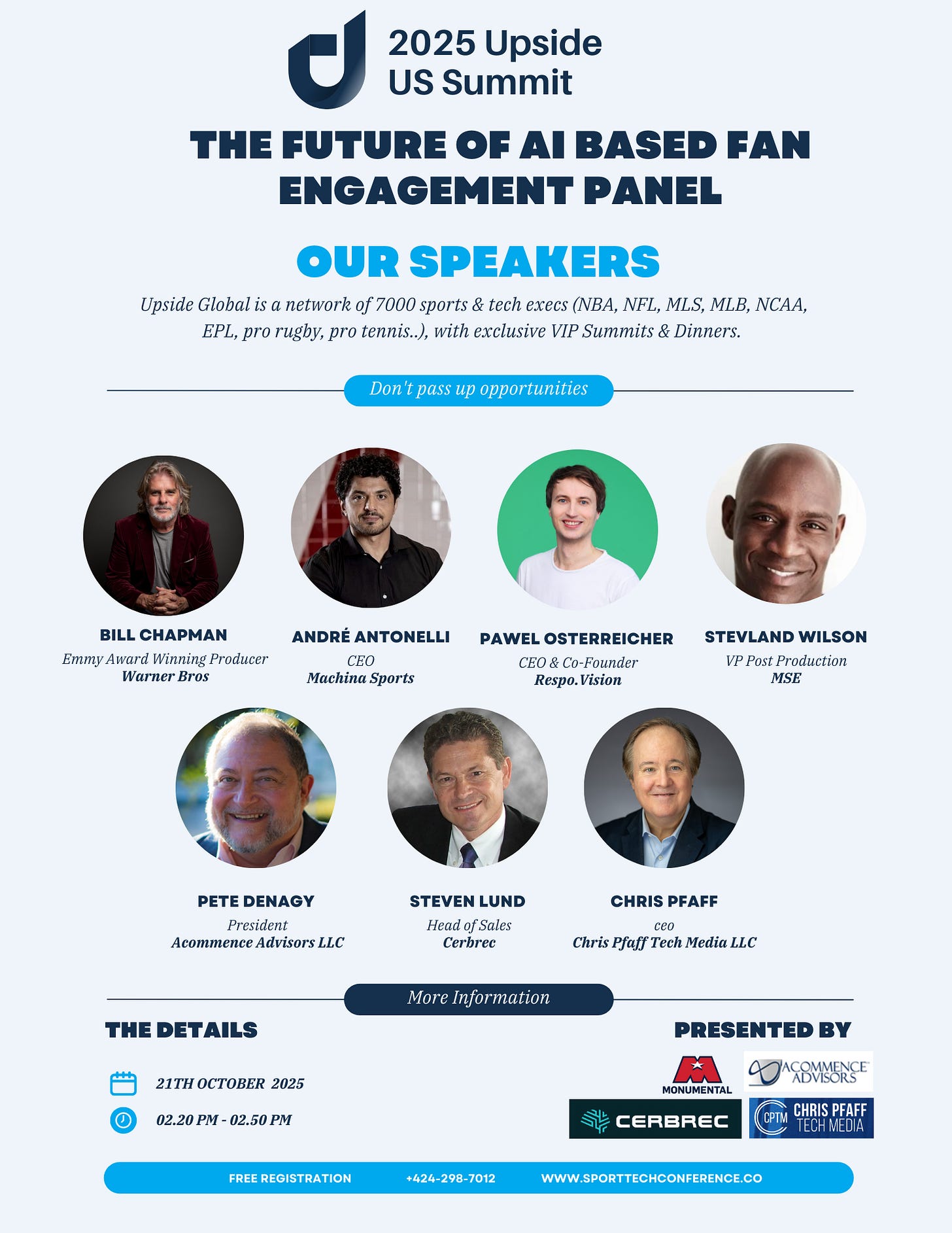 🏟️ 2025 Upside US Summit. New Speakers: Dave McConnell (Utah Mammoth/NHL), Jeff Hintz (Sports Tech HQ), Bill Chapman (Warner Bros Discovery), Pawel Osterreicher. New Sponsors: Winback, Respo.Vision