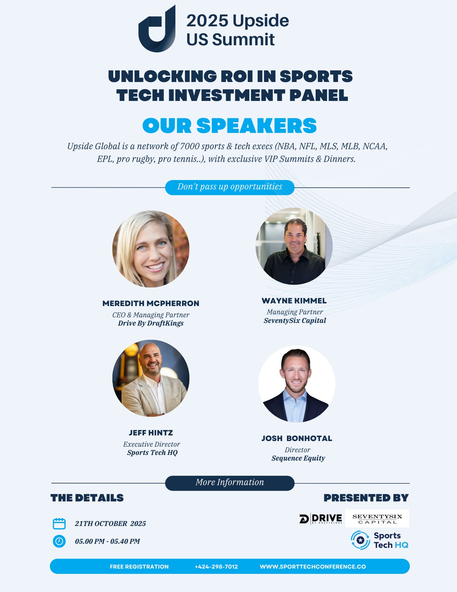 At our 2025 Upside US Sport Tech Summit, we will have 50 top speakers. You can check our first speakers below. We will soon announce many more new speakers for our 2025 US Sports Tech Summit.