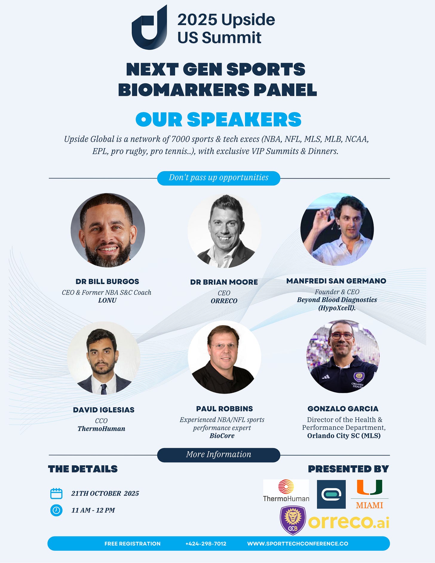 We also only have 5 booths left and we are talking to nearly 20 vendors so the booths remaining will go quickly. So if you want to exhibit, sponsor or speak at our summit, please reach out to us ASAP at julien@upsideglobal.co. We would also like to give a big thank you to our 21 sponsors namely Kinmetrix, HigherDOSE, Kinvent, Vert, Orreco, VALD, Quantum Movement, Aris, Cerbrec, Beyond Blood, BrainLit, ActivBody, OxiWear, Prism Neuro, Machina Sports, Summus Medical Laser, Box Altitude, ThermoHuman, Valor, KinetikIQ, Output Sports.