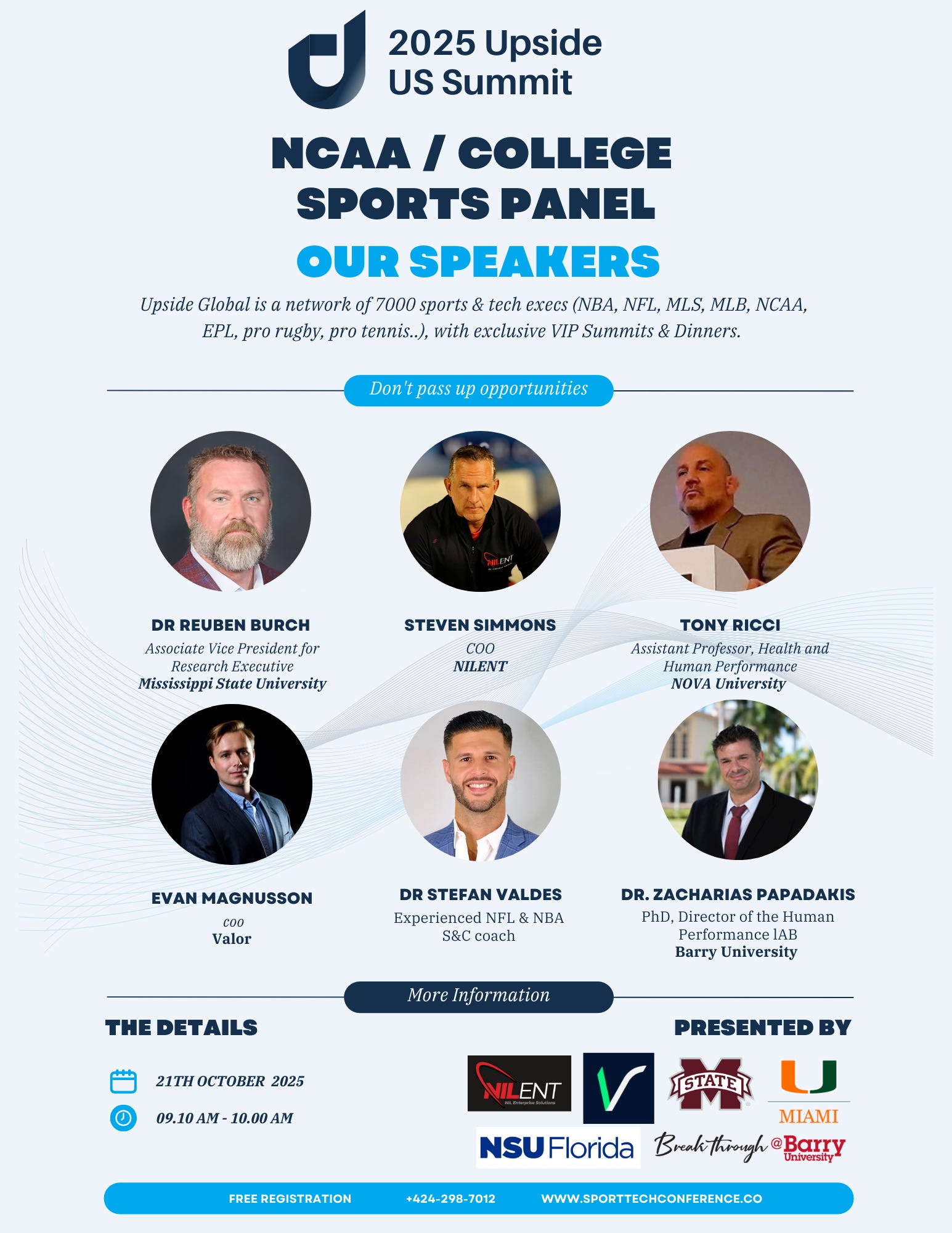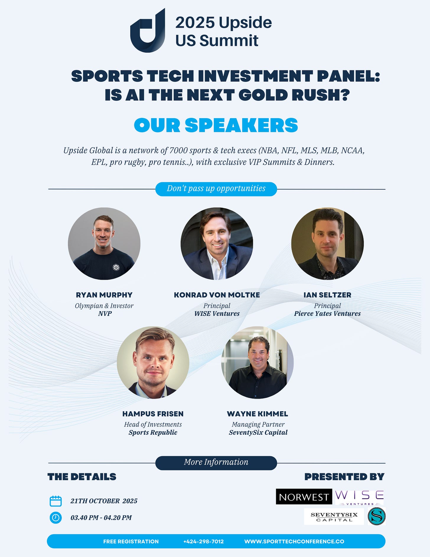 🏟️ 2025 Upside US Summit: New Speakers: Ryan Murphy (Olympian & Investor), Kianna Smith (ex LA Sparks/WNBA), Tony Ricci (Nova University), Steve Simmons (NILENT), Ian Seltzer (Pierce Yates Ventures)