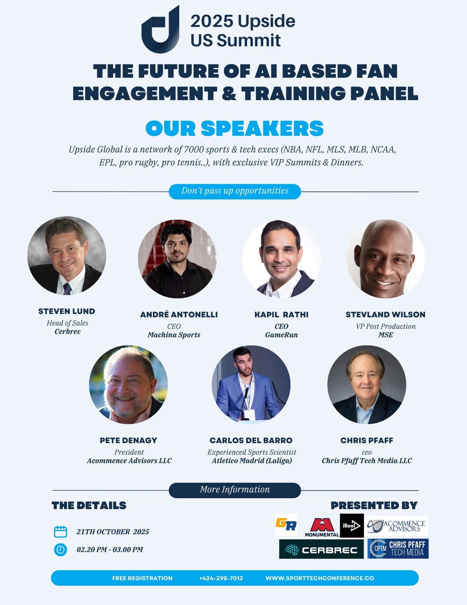 🏟️ 2025 Upside US Summit (Florida Panthers Stadium). New Speakers: Zack Evenden (ATP Coach), Erwin Benedict Valencia (MC / Ex NY Knicks), Carlos Del Barrio (Atletico Madrid), Kapil Rathi (GameRun.ai)