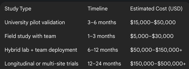 These estimates depend on variables including number of participants, lab equipment use, IRB/institutional costs, researchers' time, data analysis, and publication expenses.