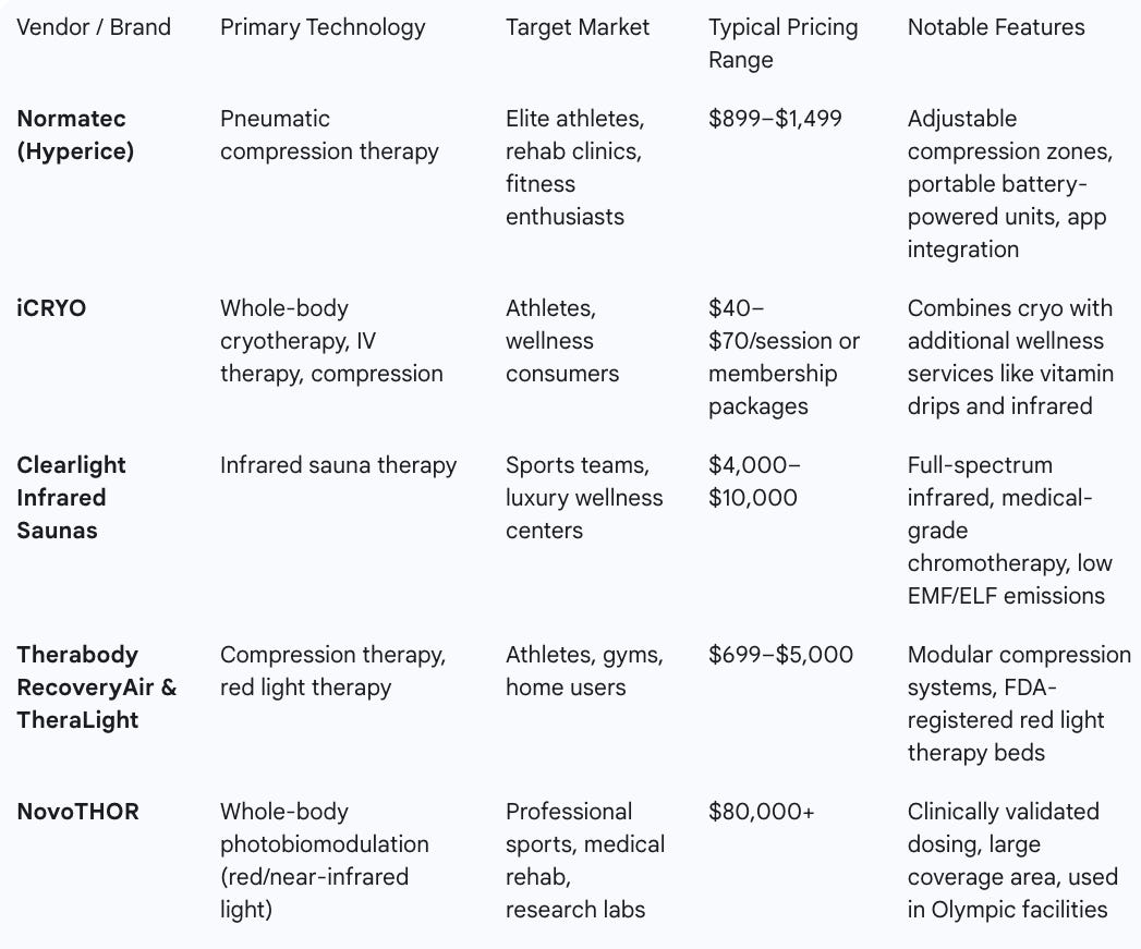 iCRYO – A franchise-style recovery service offering whole-body cryotherapy alongside IV vitamin infusions, compression, and infrared sauna options. They appeal to both athletes and the wellness market by packaging multiple modalities under one roof.