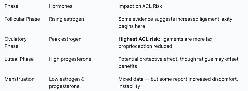 Research shows that hormonal fluctuations can impact timing and coordination of stabilizing muscles, such as glutes and hamstrings, which protect the ACL from shear forces.