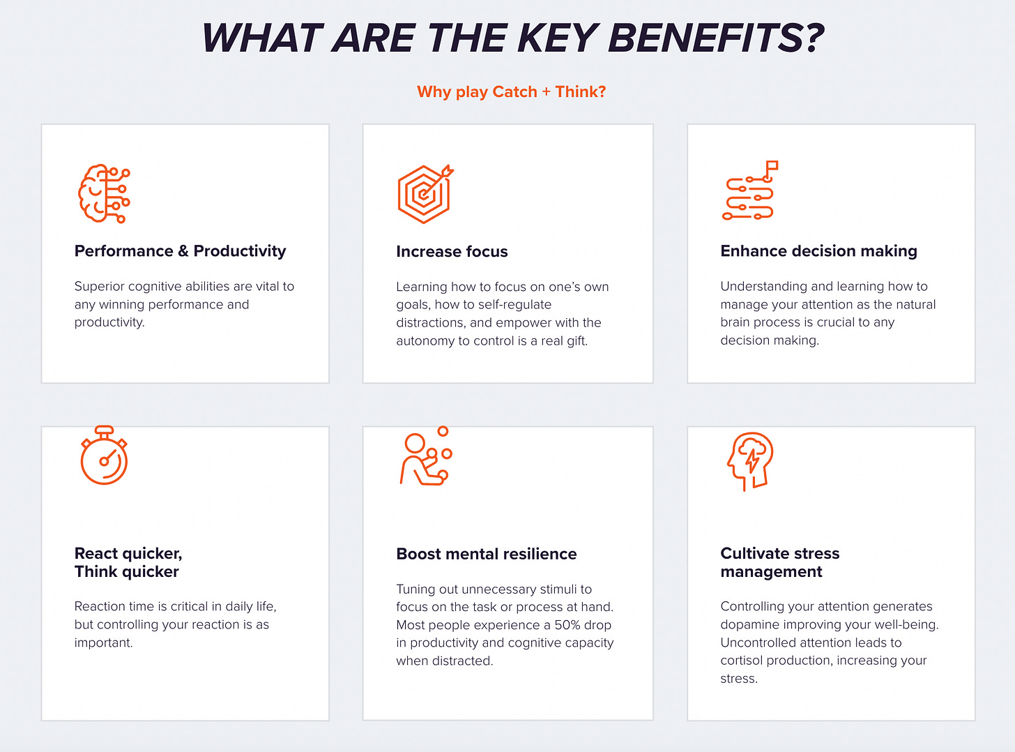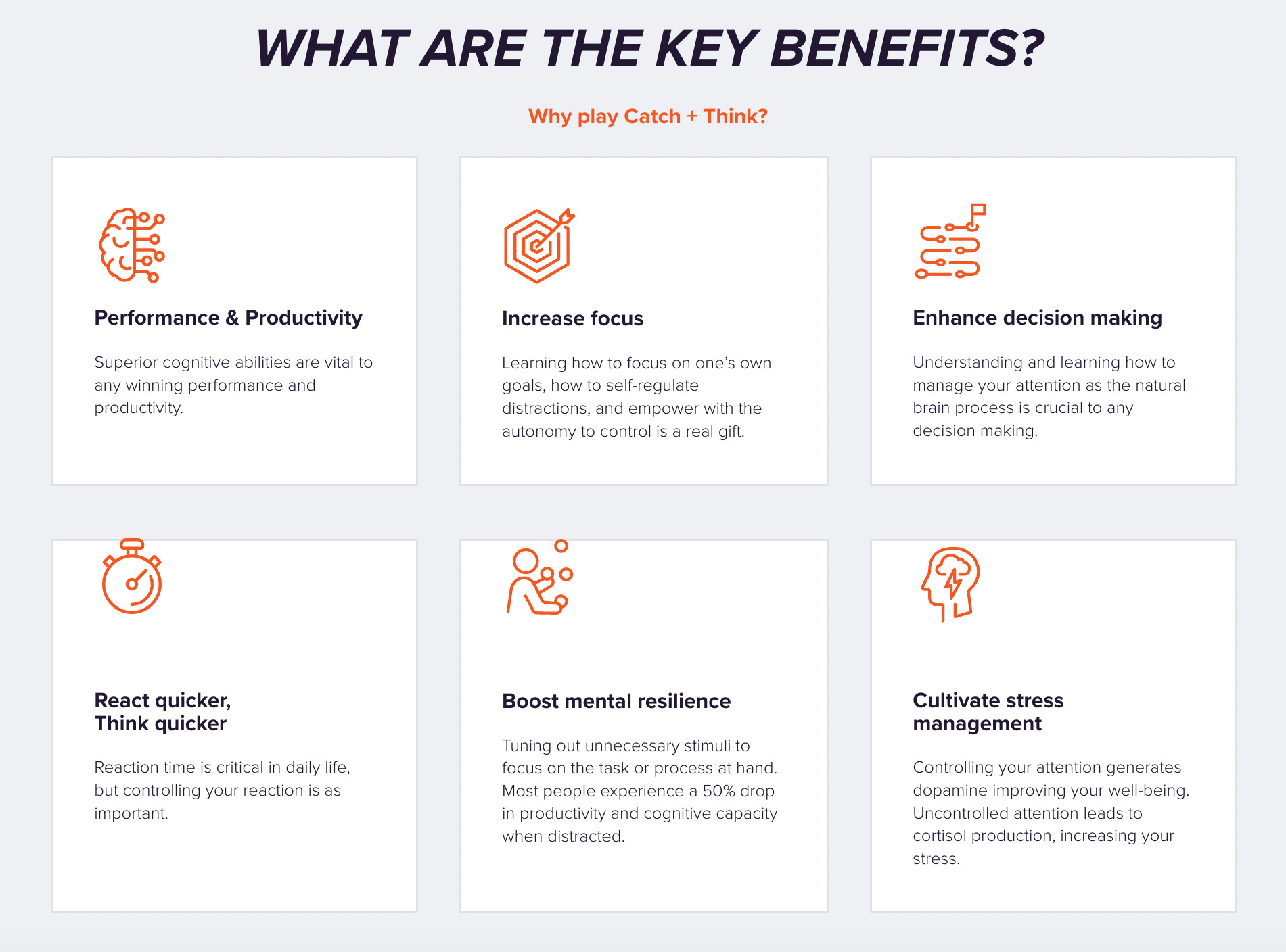 • "The base of cognitive training is when you get a stimulus or something that triggers your attention. If you can link an action to that information, that’s when your brain has to process—take in the information, analyze it, decide, and then act. So, the Catch and Think method uses this principle to train cognitive abilities."