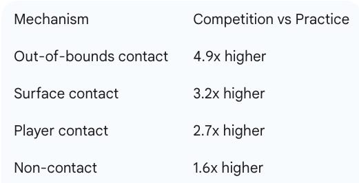 Concussion: 3.5× higher in competition