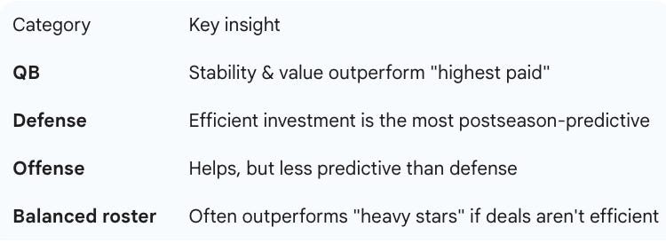 Payroll efficiency—not total spending—was the strongest predictor of playoff qualification and Super Bowl success.