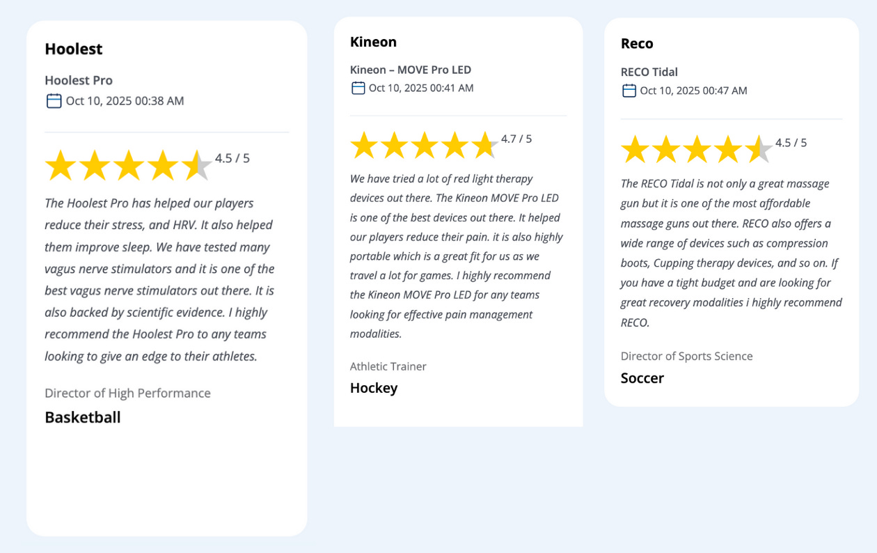 Summary: The reviewer highlights the Hoolest Proās effectiveness in reducing player stress and improving sleep and HRV. They praise its scientific backing and describe it as one of the best vagus nerve stimulators available, recommending it for teams seeking an athletic edge.