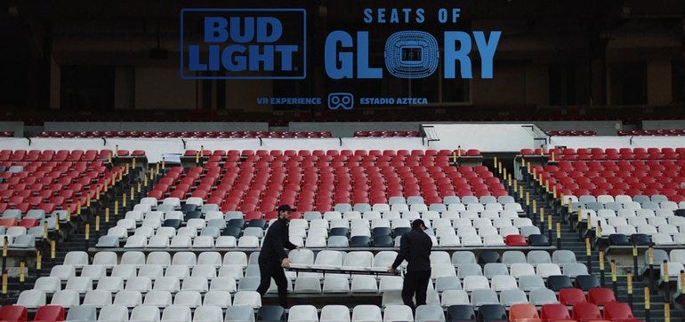 Bud Light is giving soccer fans in Las Vegas a chance to virtually experience a game 1,500 miles away with immersive technology, according to an announcement shared with Mobile Marketer. The beer brand procured four seats from Mexico City's famed Estadio Azteca, the only stadium in the world to host two FIFA World Cup finals, for fans to sit in while they wear a VR headset to watch a live game.