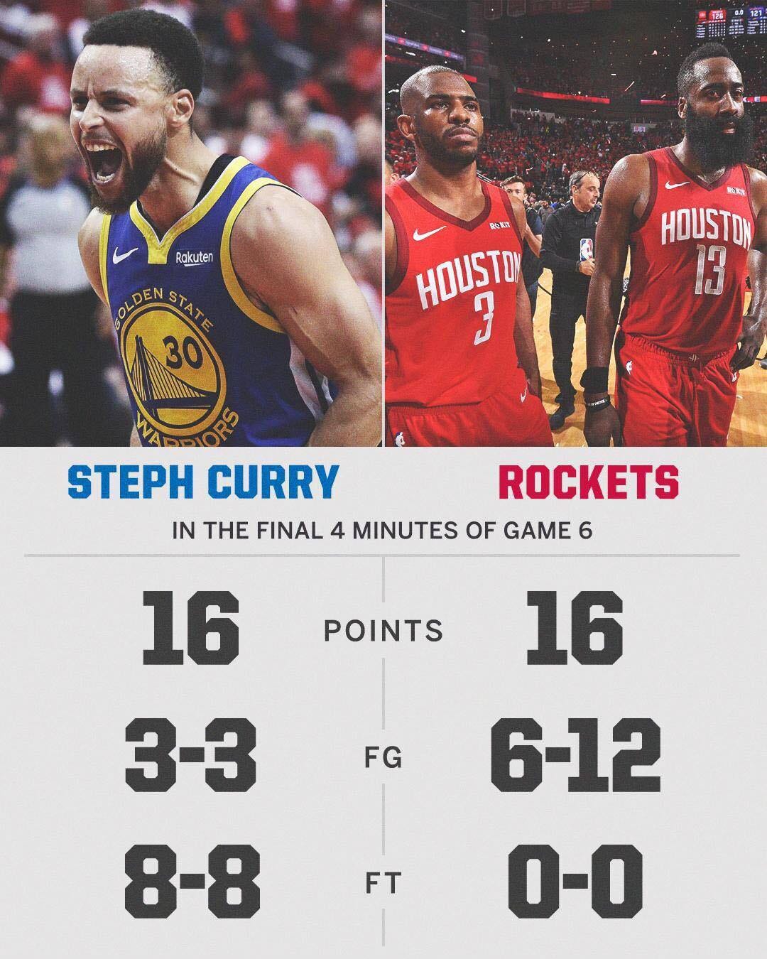 16: NBA star Steph Curry scored 16 points (3 x 3 pts) in the last 4 minutes of game 6. By comparison, the Rockets went 6/12 and scored 16 points in the same time period.