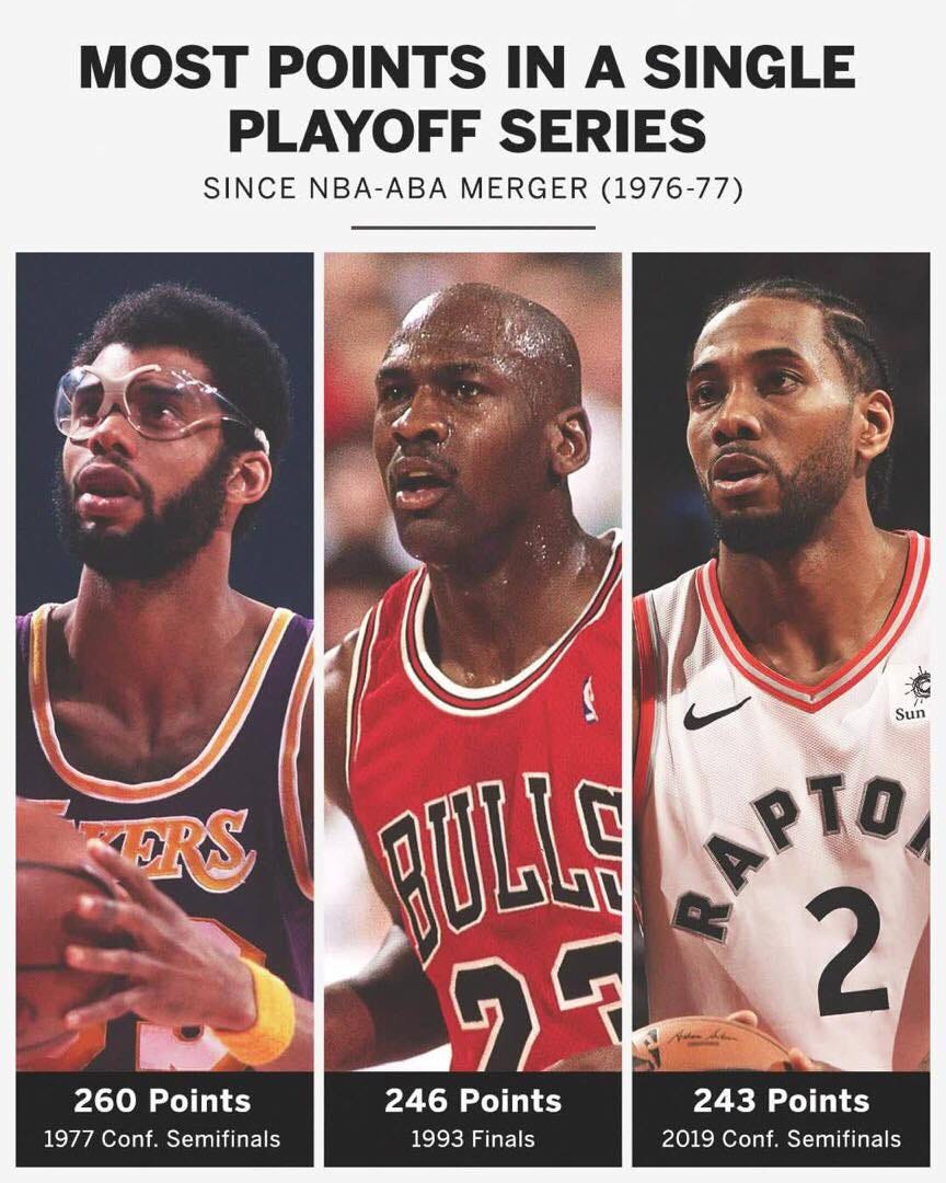 243: Kawhi put himself in some elite company, scoring 243 points in a single playoff series (Toronto Raptors Vs Denver Nuggets) following the Raptors win in game 7 against the Nuggets this weekend.